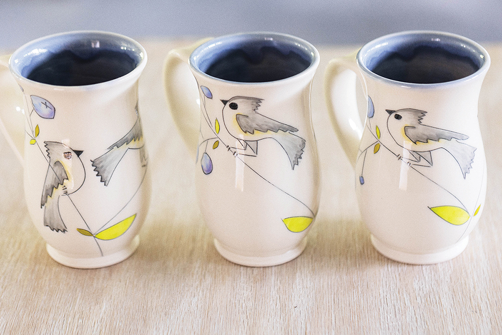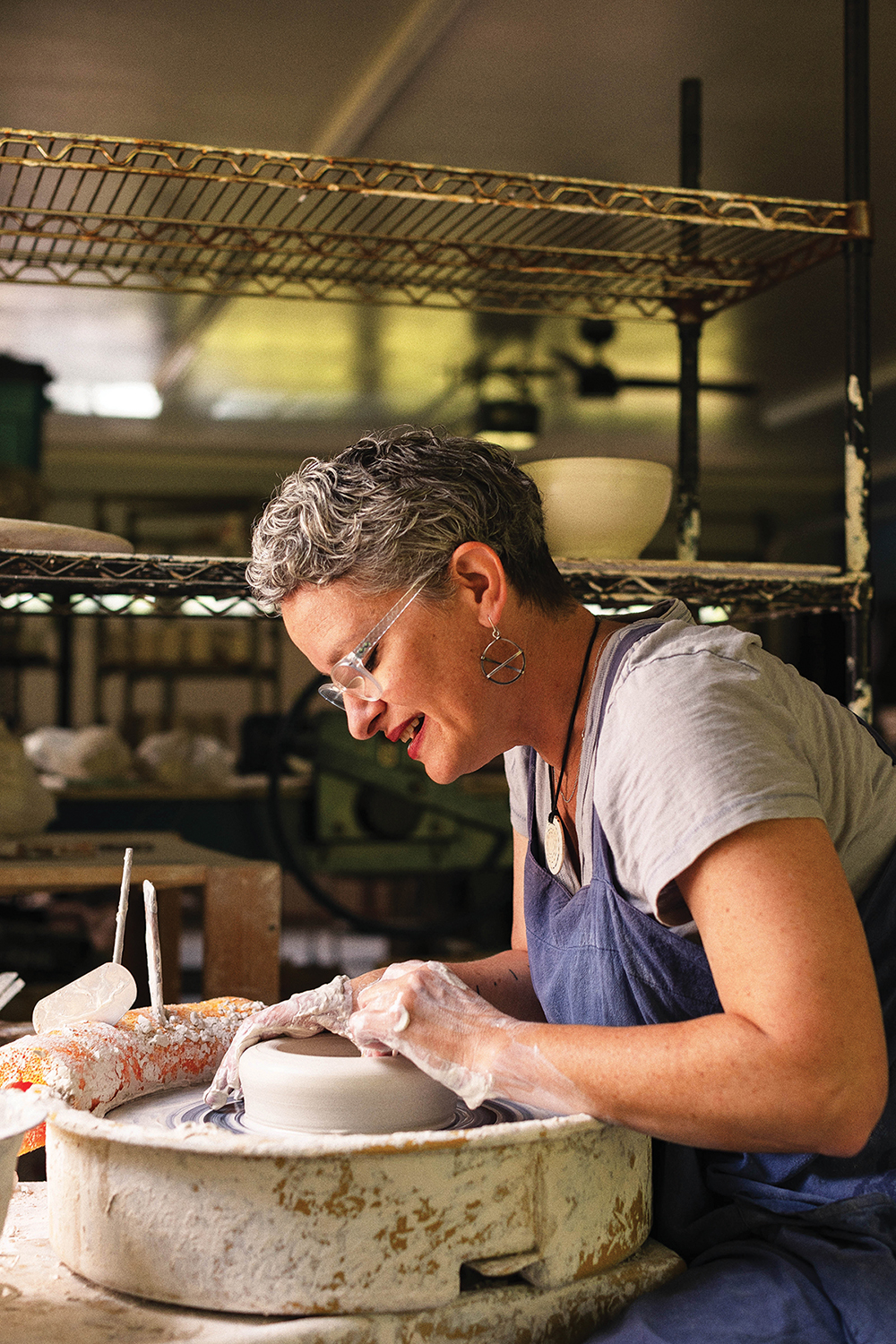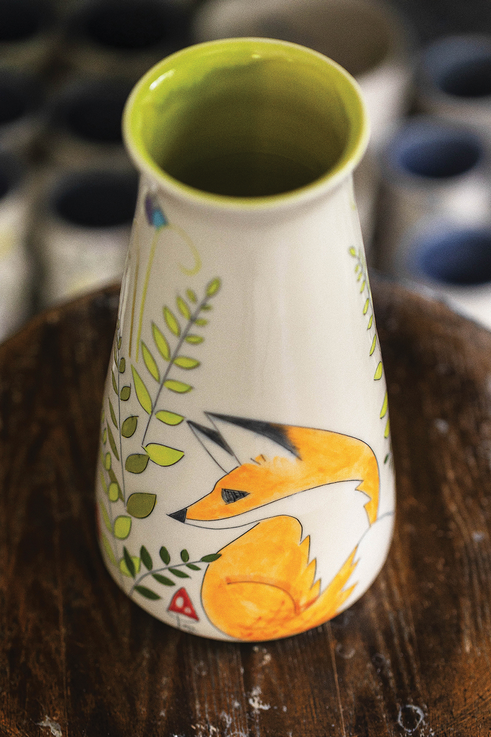 Her home’s backyard studio is a welcome upgrade from the days when the couple lived in rentals — and she’d throw pots inside a carpet-protecting kiddie pool in a spare room. Her 14-year-old daughter helps out in the studio, and fresh inspiration comes from flora and fauna right outside the window, where a family of foxes recently displaced the resident groundhog.