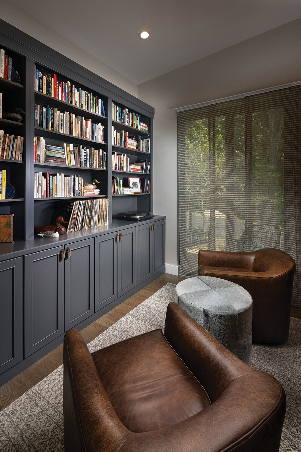 Slate blue sets the atmosphere in the cozy study’s built-in shelving and cabinets. The turntable, book, and vinyl collection are displayed, while the rest of the stereo equipment and office supplies such as printers are on slide-out drawers behind the cabinet doors, elegantly embellished with custom-made leather pulls. Sliding-glass doors lead to the small deck for al fresco reading; a paned glass pocket door is on the opposite wall.