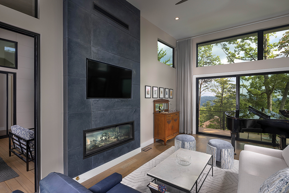 Asheville’s Vision Design Collaborative, PA, a landscape-architecture and land-planning firm, was contacted to help site the home and calculate the area of disturbance and storm runoff. “There was a steep slope area which limits the height of disturbance and [was] a lot of vertical distance to cover in a short span,” Campell explains. “It was challenging but worked out perfectly. The pitch of the driveway is not steep, and maximum views were captured.”