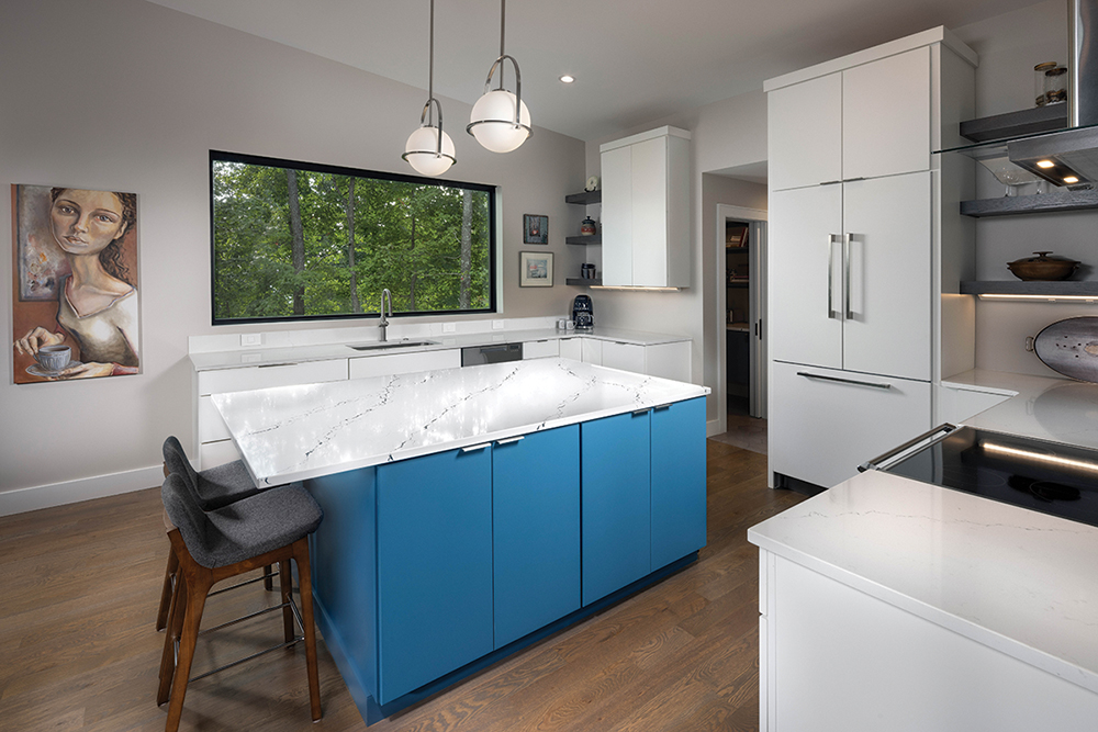 The homeowners like to cook and entertain, and the separate cooktop, sink, and counter areas provide stations for multiple people to pitch in. They are also fond of the color blue, and Taterus included several shades of it within the palette for the home. The Cambria counter on the island has some cobalt-blue veining, but not the counters on the perimeter, which are more muted in deference to the white-gray-taupe tiled accent wall. Perimeter cabinets are from the Wellborn Premier Series sourced through HomeSource Design Center in Asheville, in “River Rock” stain and “Glacier.” Open shelves display pottery collected by the owners on their travels.