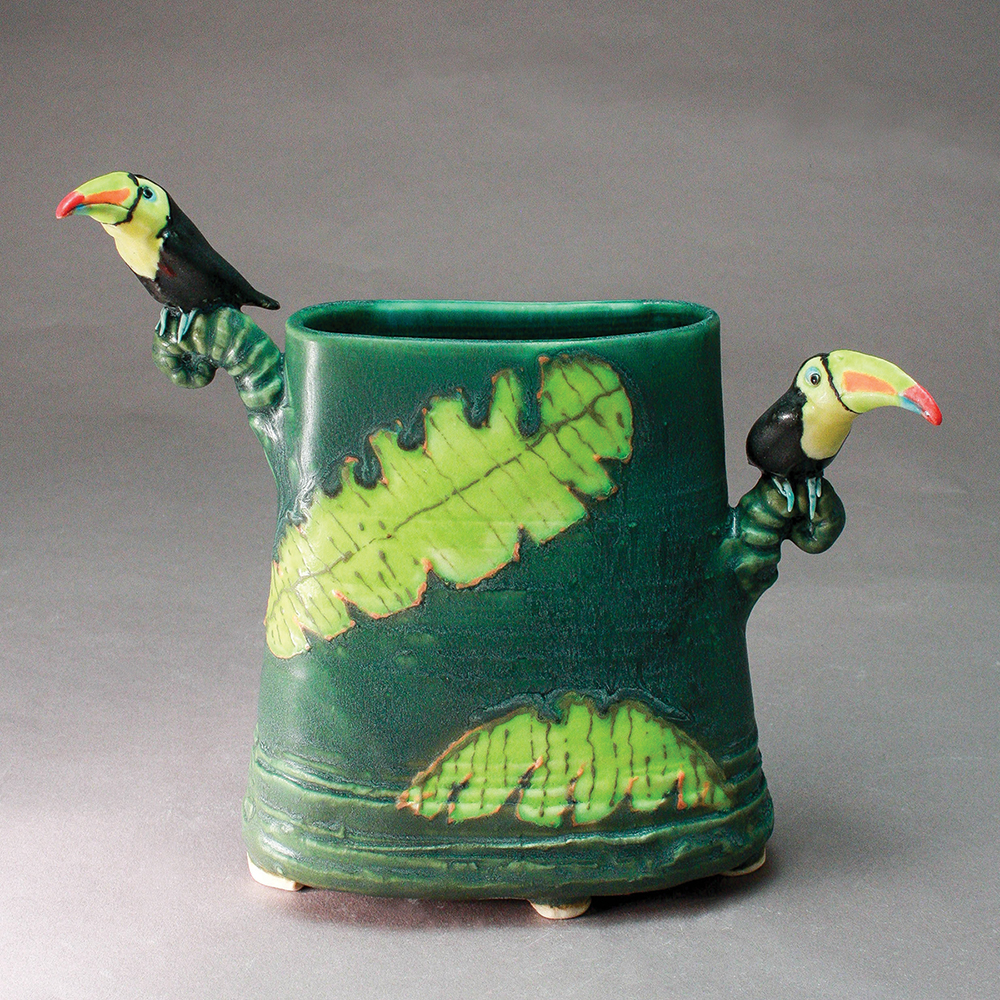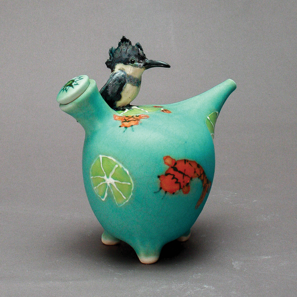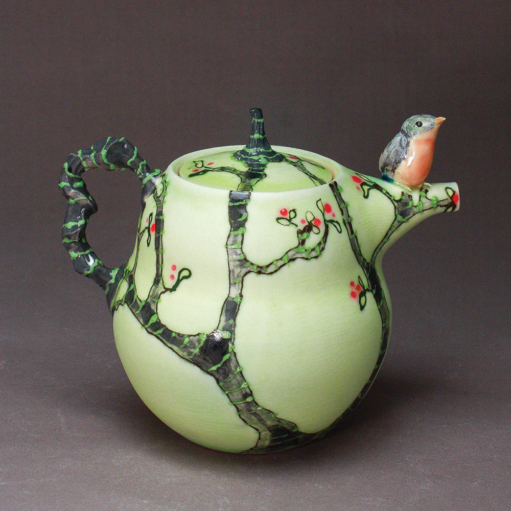 Nevertheless, she has a remarkable talent for winging it. She sculpts and paints birds of every stripe, each with its own unique and vivid personality. Some of her vases, teapots, bowls, boxes, lamps, and other vessels are adorned with orioles, chickadees, robins, crows, toucans, owls, bluebirds, sparrows, woodpeckers, cardinals, wrens, and thrushes. Others sport lesser-known exotic breeds such as hoopoes, bulbuls, and manakins.