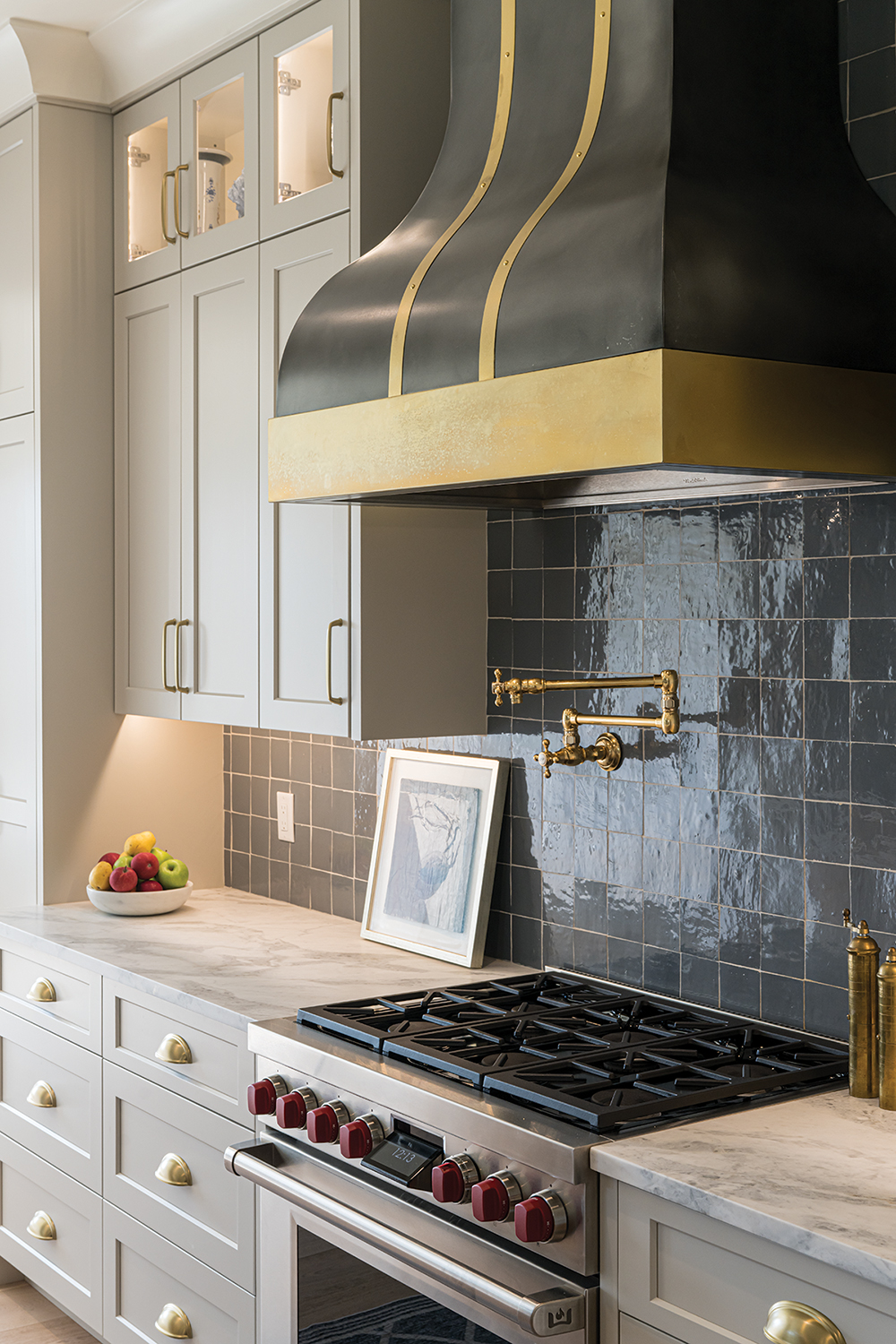 “The juxtaposition of modern amenities against the artisan craftsmanship of the custom cabinetry, Zellige tile, traditional marble countertops, brass fixtures, and classic French vent hood brought the project together beautifully,” says Inman.