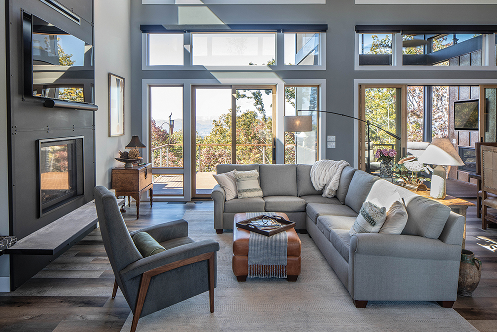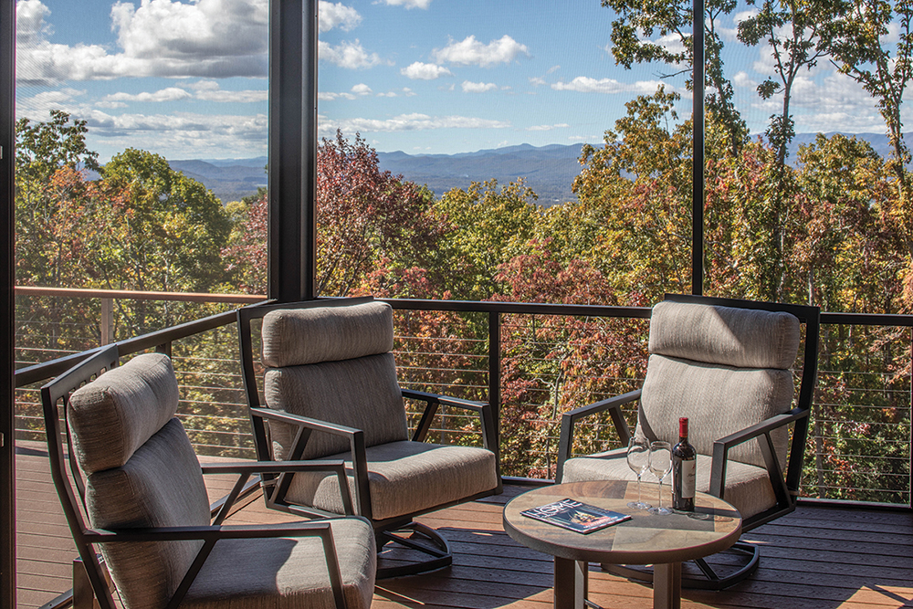 Seen here in detail, the 20-foot-high, blackened-steel fireplace surround, engineered by Mountain Sound Project Manager Norm Cunningham, claims pride of place in the open living area. Together with the floating concrete shelf at its base, this major installation is “the centerpiece of the house,” says builder Corey Black. A pair of outdoor rooms provide all-weather access; at left is a maximum-view deck and at right, a screened-in porch. The porch boasts a striking fireplace surround of its own, this one fashioned out of naturally weathering corten steel. Flooring is luxury vinyl planks by Blue Ridge Floors, further setting the tone for the active mountain lifestyle.