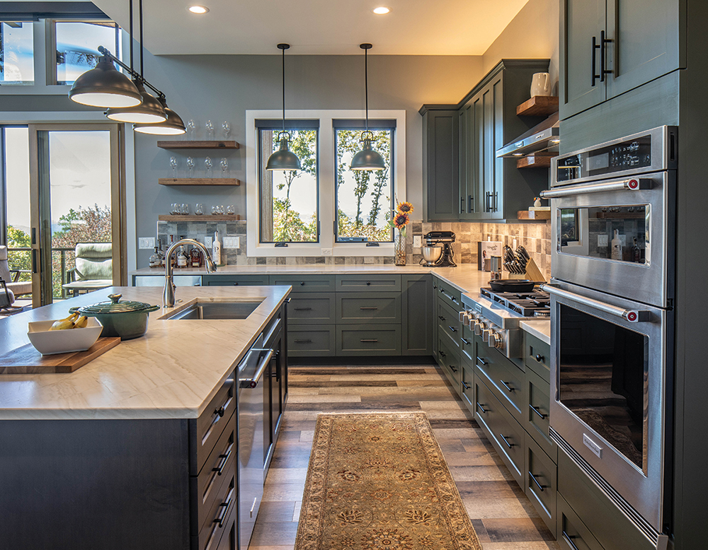 A chunky backsplash of 3D ceramic tile in “Trouvaille Greige,” via Carolina Designs, lends texture and character to the kitchen. The deep-sage shade of cabinetry with a mild Shaker edge is balanced by open, floating shelving (the latter crafted by Buffalo Construction) for wine glasses. The sleek island of “Dumont Leather” quartzite was executed with materials from SARE Granite and Tile. LVP flooring in “Ambridge Creole” is the ideal earthy complement (Blue Ridge Floors).
