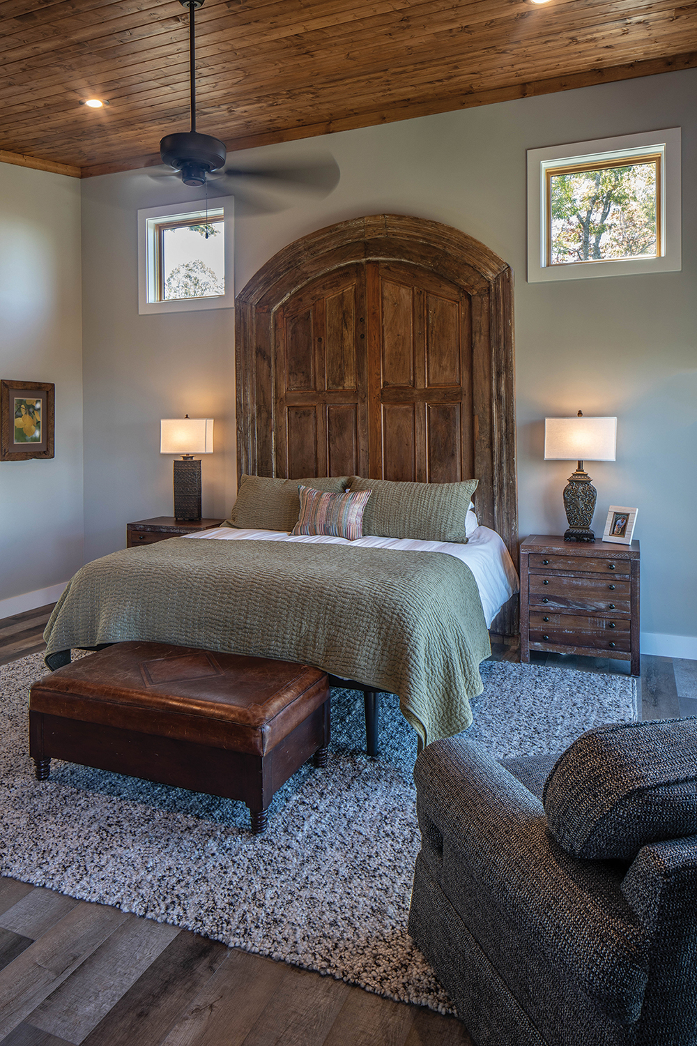 The arched, royal bed frame in the primary bedroom is nothing less than a statement piece. Architect Joshua Pettler answered its stately scale with even higher “loom windows.” Ten feet high, made of solid oak double doors, the headboard from Italy is complemented by the richly finished ceiling and the leather ottoman. Like the furniture, the nubby neutral textiles were also selected by the homeowners, who finished their interior themselves.
