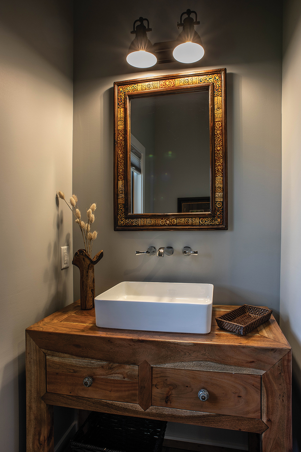 Local art: Janet Leazenby (Stretching Clay, Hendersonville); Diane Dean Fine Art (Hendersonville); powder-room vanity: Tryon Antique Mall & Marketplace