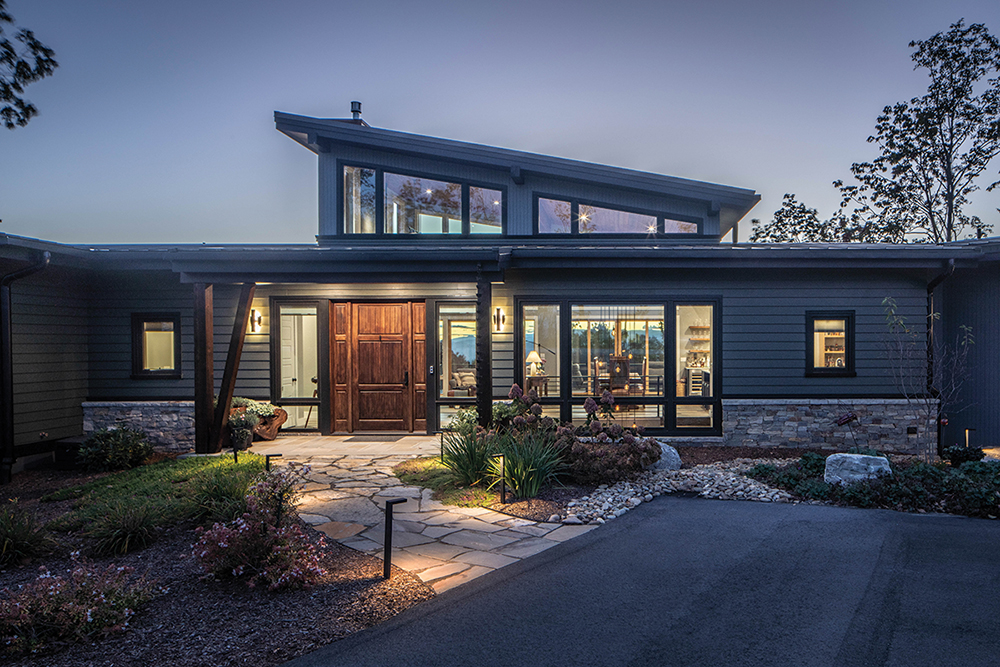 Mountain Sound Builders, owned by husband-and-wife team Corey and Anne Black, engineers all their homes to weather the fickle mountain climate. In the Couch Mountain community, that means integrating a home into a significant mountain slope. PettlerWorks Architecture introduced a linear footprint with the addition of bumped-out rooflines that stretch interior space and give additional access to light and views. The front door is solid mahogany with vertical V-groove beaded insets, made by Rogue Valley Door, an artisan company in Oregon.